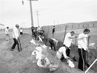 6月3日,呼铁局临策基础部苏红图综合车间职工在菜地周边栽种红柳。该车间地处戈壁深处,6年来陆续开辟的4亩多菜地深受沙害袭扰。职工挖来红柳小苗,栽种在菜地四周,为菜苗遮挡风沙,也美化了车间环境。(付爱民 摄)