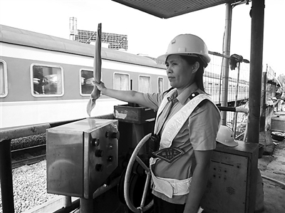 玉林工务段湛江线路车间的一处铁路道口瞭望条件差,过往行人多且车流量大,时常导致道口交通堵塞。道口工蔡文英凭着熟练的业务技能和责任心,18年如一日,风雨无阻守护着道口安全。 谭育俊 摄