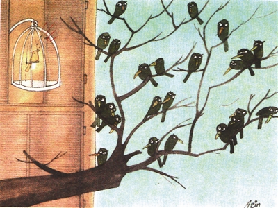 笼中鸟苦中作乐渴望回归大自然,树上的同类却羡慕其舒适和悠闲,彼此相望默默无语。假如双双换位,将是如何感言?【伊朗】马兹哈