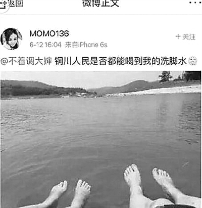 最近一名微博名为“MOMO136”的女网友,不仅在禁止戏水的桃曲坡水库边洗脚,还配发洗脚照推出了一条微博:“铜川人民是否都能喝到我的洗脚水?”