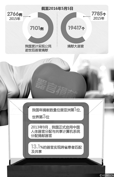 在我国,公民自愿器官捐献起步于2010年3月,当年公民自愿捐献数量仅34例。5年后,国家全面禁用死囚器官,公民自愿捐献成为器官移植唯一合法来源。这一年,中国公民器官捐献人数达2766例,器官移植数量超历史纪录。