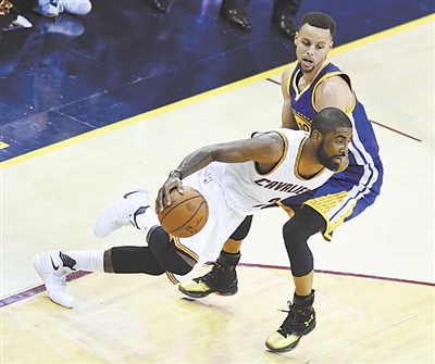 骑士队球员欧文(左)在比赛中突破勇士队球员库里的防守。