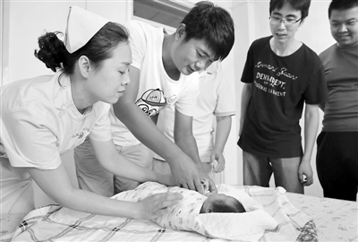 6月18日,新爸爸在医护人员指导下学习包裹婴儿。