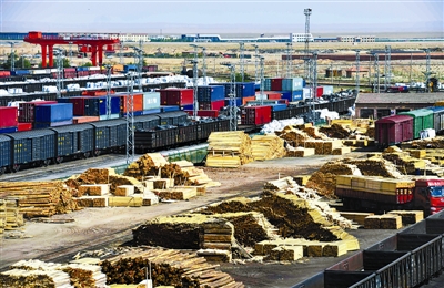 6月19日,工程车辆在二连浩特铁路货场装运进口木材。
