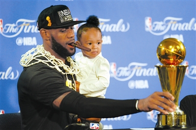 图为骑士队球员勒布朗·詹姆斯抱着自己的女儿出席赛后记者会。 新华社发