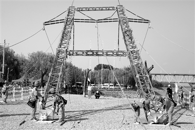 6月15日,在山东电网2016年防汛应急演习现场,山东滨州供电公司员工正在组立110千伏罗铁线12号抢修塔