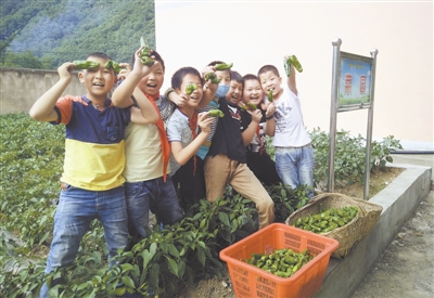 6月20日,湖北省保康县过渡湾镇二堂八一希望小学举办“校园收获节”,学生们迎来辣椒大丰收。 该校于2015年建立450平方米的红领巾菜园基地,学生在老师的指导下,通过参与农作物的种植、管理、采摘等全过程,认知自然,体验劳动的辛劳与收获的乐趣。杨韬 董修青 摄