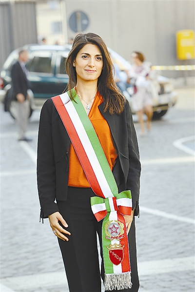 ——19日,在罗马市长选举第二轮投票中,来自主要反对党“五星运动”的拉吉以67%的票数击败左翼民主党人罗伯托·贾凯蒂,成功当选为罗马市长,成为罗马有史以来首位女市长。拉吉在当选后表示,“我们正在开启一个新时代”。(图为当地时间6月22日,意大利罗马,罗马美女市长拉吉佩戴象征意大利国旗的三色绶带,出席就任以来的第一次公共会议。东方IC 供图)