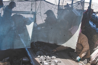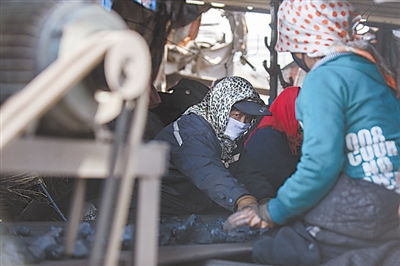 4月8日,吴代珍在一家煤场分拣煤矸石。半年前,她的丈夫从这家煤场辞职外出打工,她接替了丈夫的工作。
