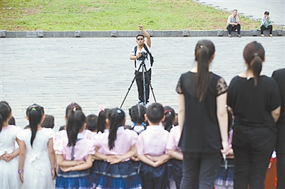 6月15日,毕智慧在公园内为幼儿园小朋友拍摄毕业视频。他曾是晋煤集团的一名一线矿工,今年6月,他停薪留职后加盟了朋友的影视公司,成为了一名专职摄影师兼导演。