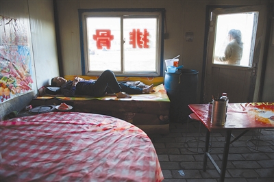 4月9日下午,矿区附近的一处饭店,老板赵富躺在床上休息。他饭店的主要客源是跑矿的卡车司机。随着当地煤炭产能的减少,来这里就餐的司机也比以前少了许多。