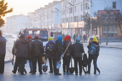 4月10日,山西省朔州市平鲁区,在劳务市场准备前往煤炭采空区植树的矿区民工。露天煤矿的大面积开采给生态造成了极大破坏,如今矿区绿化、植被恢复成为当地政府生态建设的重点。
