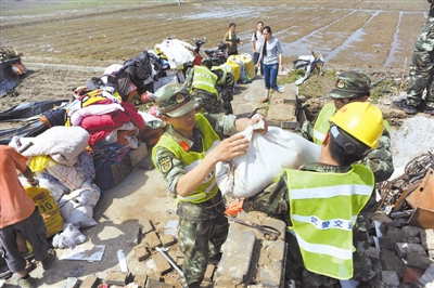 武警官兵在灾区救援。本报记者 王伟伟 摄