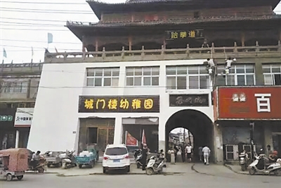 据媒体报道,安徽亳州市区的一座建于1988年的仿古城楼,出售给个人后一直被用于商业经营。近日,这座城楼原有的砖青色被个体商户“刷了大白”,城门楼上甚至还挂上了“跆拳道”牌匾。