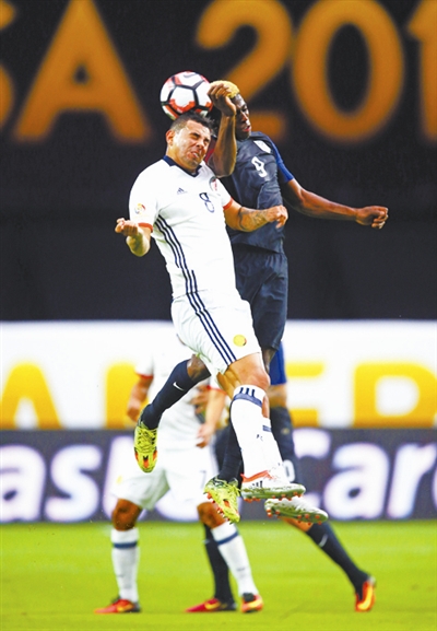6月25日,哥伦比亚队球员卡多纳(左)与美国队球员扎德在比赛中争顶。