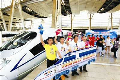 6月15日,京津城际首个旅游品牌专列“欢乐谷号”在北京南站发车。