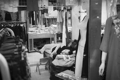6月25日下午,河北廊坊新动批红门服装城内顾客稀少,一位老板在铺位上打盹。本报记者 吴凡 摄