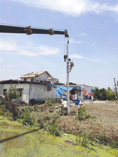 常州电力抢修队在阜宁灾区的抢修现场进行电杆、导线等电力设备的整治