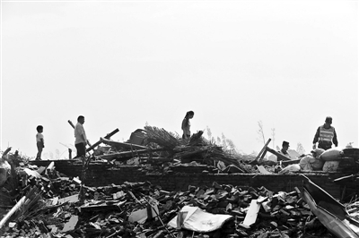 龙卷风过后的阜宁,建筑物倒塌现场。