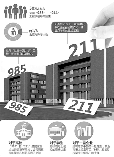 “作为高三考生的家长,‘211’,‘985’早已深入我心。”某考生母亲说,为了孩子填志愿,她半年前就开始了解“985”“211”高校的情况。“多数家长已对这两个称谓形成了深刻印象,成为替子女考虑择校的标准。”