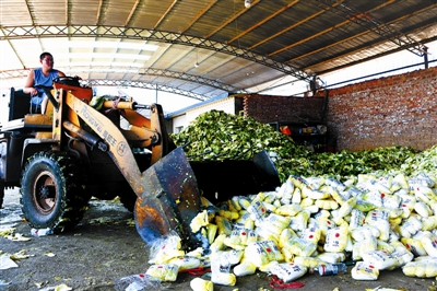 7月4日,在兰州市红古区花庄镇一收购点,工人用推土机铲掉未售出而变质的成品娃娃菜。