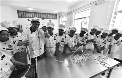 7月7日,山西国际面食学校教师徐根源(左三)为西藏班学员示范“一根面”的做法。