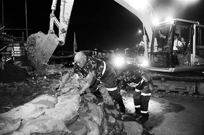 7月7日凌晨,武汉市江汉区沿江大道龙王庙闸口,防汛抗洪的工作人员正在加固沿江堤坝。当日,闸口将建起一座高4米的脚手架,用于堆放和固定沙袋。本报记者 王伟伟 摄