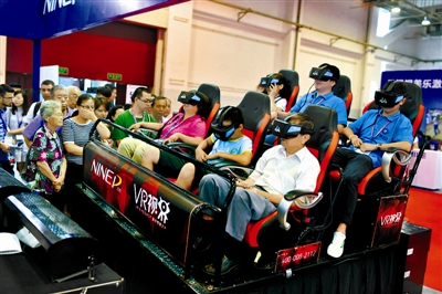 7月7日,参观者在电子博览会上体验一款VR视界360度旋转平台。