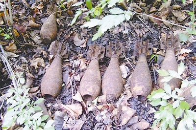 不敢用铁镐用力刨,杨国庆只能跪下身来,用手扒开一层层落叶和泥土。首先露出来的是尾翼,又过了不到1分钟,伴随着自己噔噔噔的心跳,6枚完整的日军炮弹展现在了他的眼前。