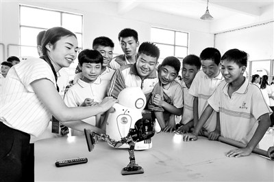 7月4日,“中国流动科技馆——岑巩站巡展”活动在贵州凯里的岑巩县正式启动,吸引千名青少年现场参观体验。这个馆设置了声光体验、电磁探秘、运动旋律、数字魅力等10个主题展区,共有50件互动展品,为公众提供了参与科学实践的场所,在互动中感受科学魅力。图为孩子们对机器人充满兴趣。杨家嫦 摄
