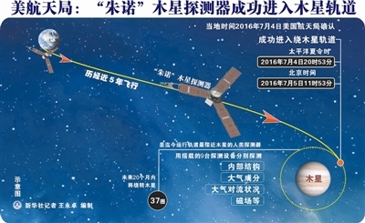 北京时间5日11时53分,经过近5年的太空航行,美国航空航天局的“朱诺”号探测器,成功进入环绕木星运转的轨道。