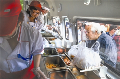 为解决社区老年人就餐难题,北京房山区新建了一个燕山老龄餐车服务中心,由当地大型餐饮饭店定时定点配餐。持老年优待证、养老助残卡、残疾证购餐的用餐者可享8折优惠。目前“中央厨房”的流动送餐服务已惠及30多个社区,今年将在全市推广。