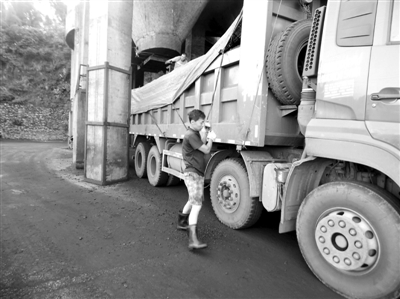 8点整,杨文光和舒涛两名放煤工分别站到离地3米多的高台上准备为前来运煤的客户放煤。一前一后两辆货车依次进入装煤位置。待货车停靠后,只见杨文光费劲地打开储煤罐开关,煤炭立即争先恐后地涌入货车车厢,粉尘随即向他扑过来,而热辣的太阳也不失时机地赶来凑热闹,把气温早早地升到了33摄氏度。汗水顺着他的脸颊流下来,不一会儿他的衣服就像从水里捞出来一样,脸上也变成了黑一块白一块的。但负责任的工作态度使得他全神贯注地盯着下泄的煤流,不敢有一丝懈怠。