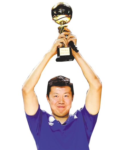 手举“突出贡献”奖杯的王治郅终于向职业生涯说再见。本报记者 许之丰 摄