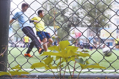 2016年7月3日,几株爬山虎顺着球场外的铁丝网攀爬生长。当天下午,北京市天通苑社区足球赛冠亚军决赛在西三区笼子球场开战。从2003年开始,社区足球赛在居民自发组织下已举行了9届。