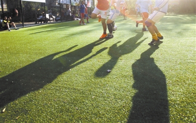 6月中旬,足球场的水泥地终于铺上了人造草皮。