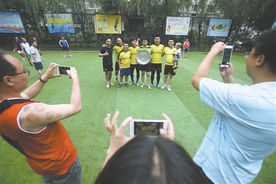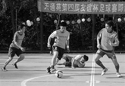天通苑社区,坐落在北京市北五环外,聚居人口30万人以上,号称“亚洲最大社区”。李建和11位足球爱好者在2003年启动了天通苑第一届足球比赛,之后中断过几年,直到2010年才开始每年举行一届,现在主力队员常年保持在六七十人。和比邻的另一个超大型社区回龙观足球赛——“回超”的大张旗鼓不同,这里的足球赛更显“草根”:球场是由一个网球场改造而成;有的参与者上一场是运动员,下一场可能变成裁判员;球场难免有冲突,谁要“爆发”就会有“大哥”上前劝阻,都是街坊,一句安慰的话、一个安抚的手势即可化解。为了增强参赛者的荣誉感,3年前,相熟的几个球友一起出资近2万元,打造了一个银质奖牌,每年的冠军队伍可以保管一年,这是整个球赛迄今最大开销。