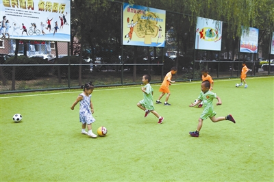 此刻,在旁边同样大小的球场里,一群小朋友正在专业老师的带领下进行足球训练,场面如火如荼。