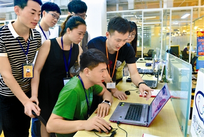 7月11日,在石家庄互联时空众创空间,青年创业团队进行互联网软件的开发。