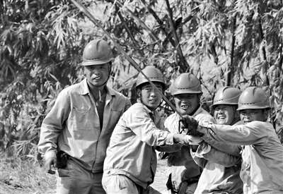 7月12日,国家电网福建晋江市供电有限公司职工在闽清县云龙乡抢修被洪水冲毁的10千伏线路。