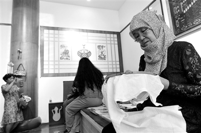 游客在宁夏吴忠市穆民新村欣赏传统非遗项目(7月10日摄)。