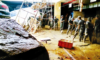 7月13日,海防某师官兵在永泰县一处地下停车库清理淤泥。