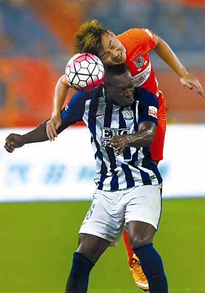 7月13日,石家庄永昌队球员门迪(下)在比赛中与对方球员争顶头球。