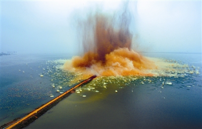 7月14日7时,伴随着一声声的爆破轰鸣,梁子湖与牛山湖隔堤正式实施爆破作业,这标志着湖北梁子湖流域的牛山湖正式破垸分洪。