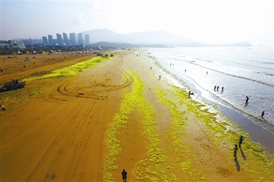 7月14日,在山东省青岛市石老人海水浴场,部分浒苔“登陆”海滩,给沿岸环境带来一定影响,当地管理部门动用挖掘机、运输车辆进行清理。 新华社发