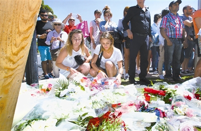 在法国南部旅游城市尼斯,7月14日晚,一辆卡车冲入在英国人大道上庆祝法国国庆的人群中,造成70余人死亡、百余人受伤。图为15日人们在袭击事件现场附近摆放鲜花悼念遇难者。