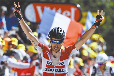 北京时间7月15日,2016环法自行车赛进入到第12赛段的争夺。总成绩领跑者、天空车队的英国车手弗洛姆在本赛段最后时刻遭遇撞车,但依然以57小时11分33秒继续排在总成绩榜的第一位。图为参赛选手在比赛最后阶段艰难冲刺后高举双手,庆祝完赛。 视觉中国 供图