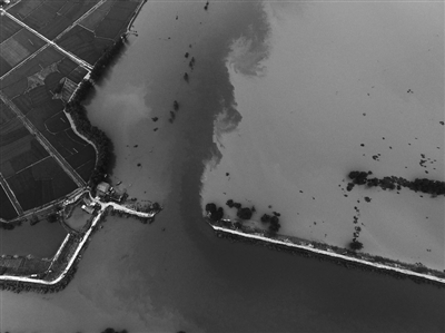 这是7月17日航拍的黄梅县濯港镇丁字街村考田河堤坝溃口。