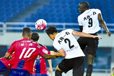 7月17日晚,在中甲联赛第18轮比赛中,北京北控队主场3比0战胜大连一方队。图为双方球员门前争顶。本报记者 许之丰 摄