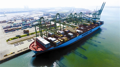 7月18日,天津,美景马士基轮在天津港太平洋国际集装箱码头进行装卸作业。